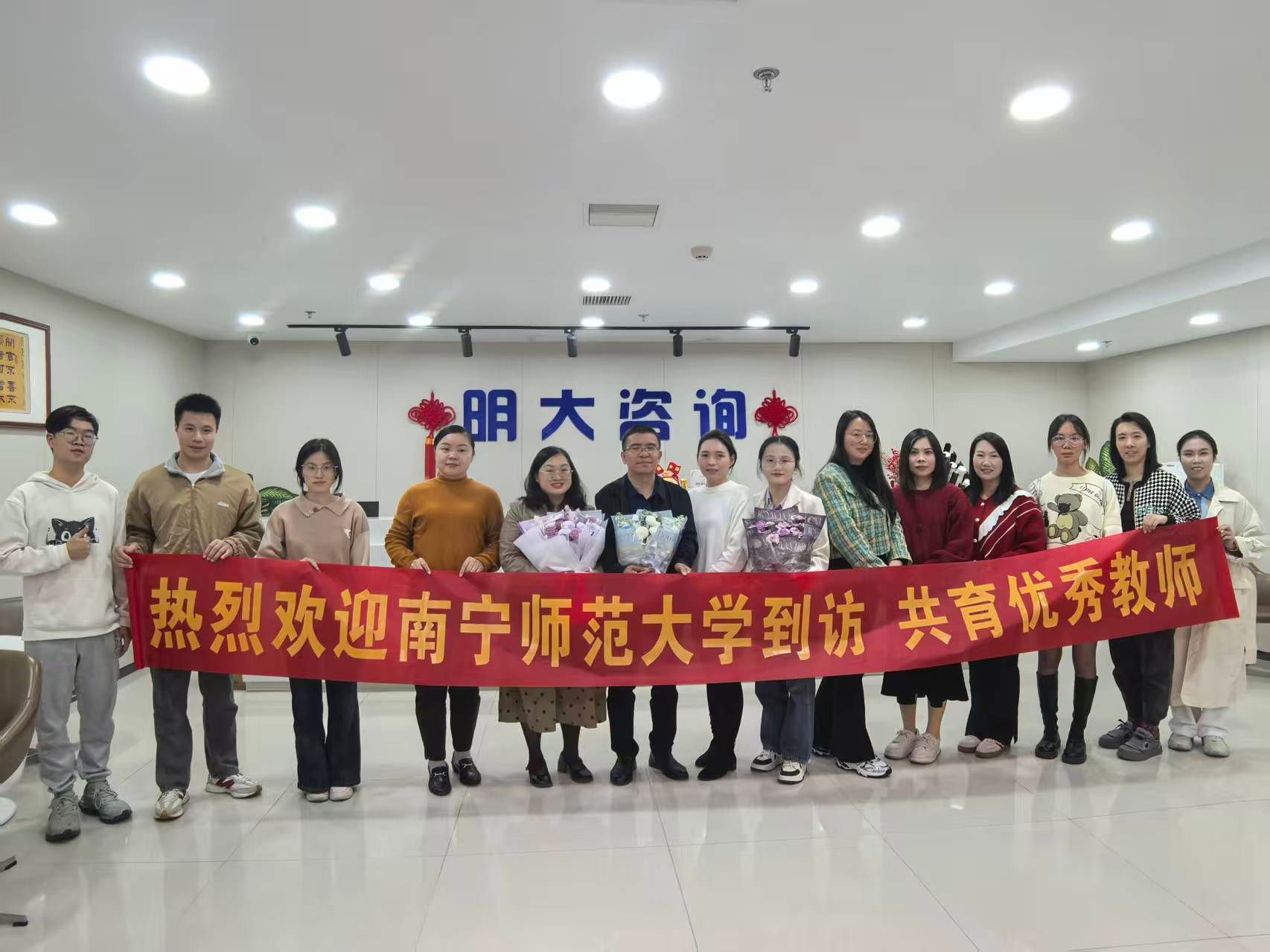 为精准对接企业用人需求,助力毕业生高质量就业,10 月 23 日下午,数学与统计学院党委副书记王卫彬、团委书记梁卡霖、辅导员滕容梅带领毕业班学生代表,前往南宁明大教育开展访企拓岗活动。明大教育人力总监陆庆熊及南宁各校区教学主管热情接待,双方围绕校企合作、毕业生就业等议题展开深入交流。