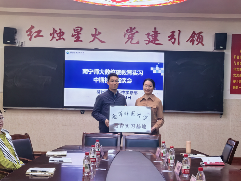 4月24日上午,我校教育实习基地授牌仪式在柳州市第十五中学总部隆重举行。我校数学与统计学院副院长韦扬江、团委书记梁卡霖,柳州市第十五中学总部执行校长梁欢、教务处副主任李燕利等校领导和数学教研组教师代表出席仪式,我校2023级数学与应用数学的实习生代表也参加了授牌仪式。