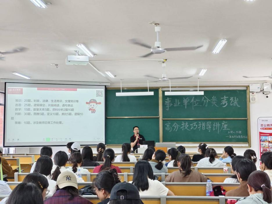 为助力2022级应届毕业生备战事业单位考试,提升职业能力测验应试水平,学校于3月25日下午在实验2A-301教室顺利举办事业单位分类考试高分技巧指导讲座。本次讲座由学生就业中心主办,数学与统计学院承办,讲座特邀专注于广西公考辅导13年的志公教育学科带头人万琨老师主讲,数统学院辅导员滕容梅老师到场主持,武鸣校区毕业生到场学习。