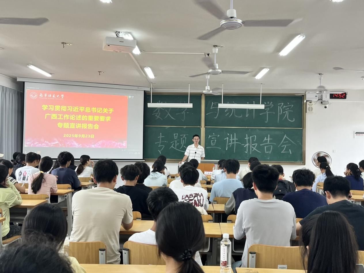 为深入学习贯彻习近平总书记关于广西工作论述的重要精神,推动党的创新理论有效触达青年群体,9月23日,数学与统计学院组织师生在实验2-A603、C504教室集中观看贯彻习近平总书记关于广西工作论述的重要要求专题宣讲报告会。校党委书记张鹏在会上作题为《牢记殷切嘱托 贡献青春力量 为奋力谱写中国式现代化广西篇章挺膺担当》的专题报告。