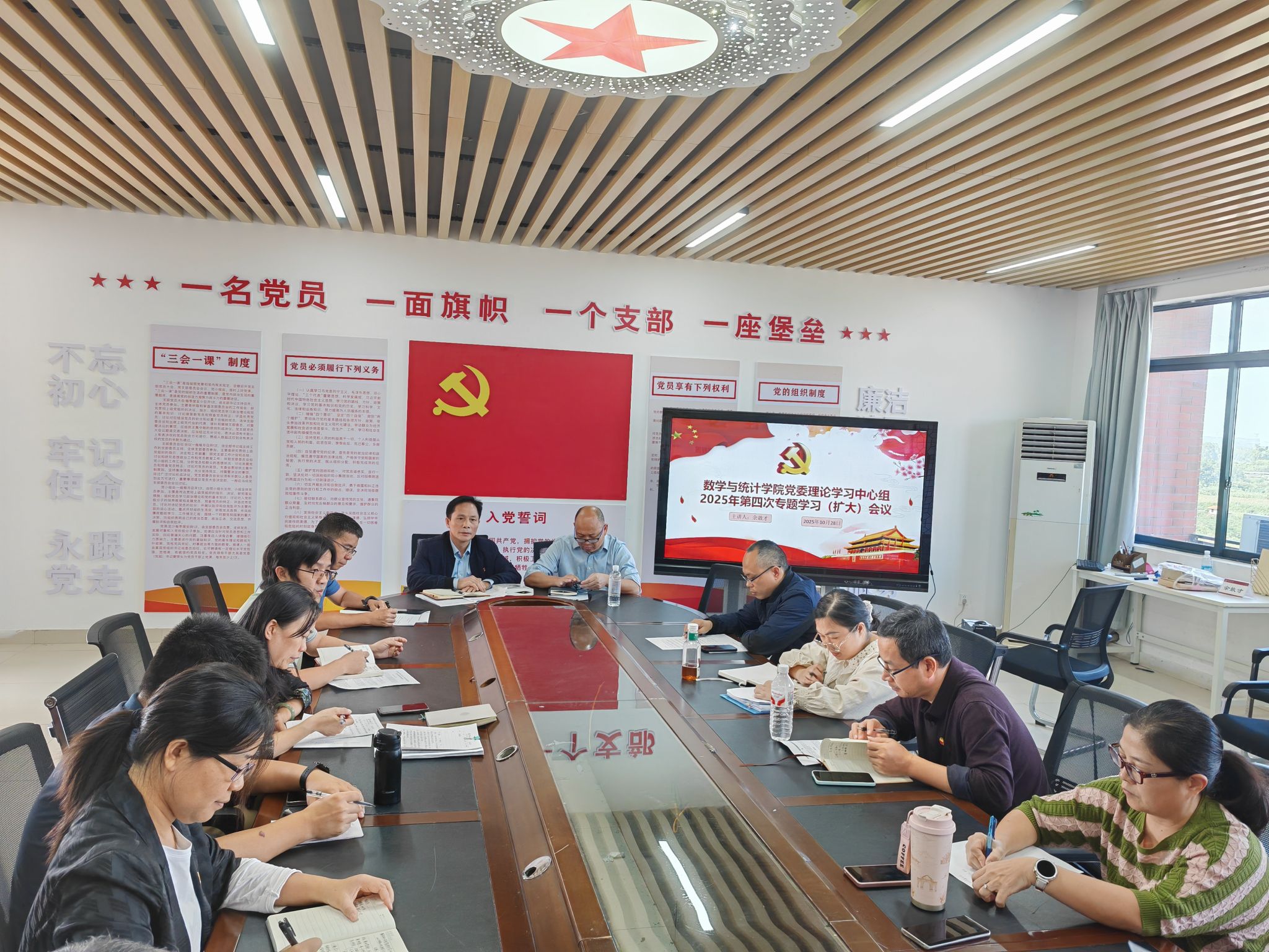 10月28日下午,数学与统计学院党委理论学习中心组在武鸣校区数统楼A501室召开2025年第四次专题学习(扩大)会,学院党委理论学习中心组成员参会,党委委员、各党支部书记列席会议,会议由学院党委书记余敢才主持。