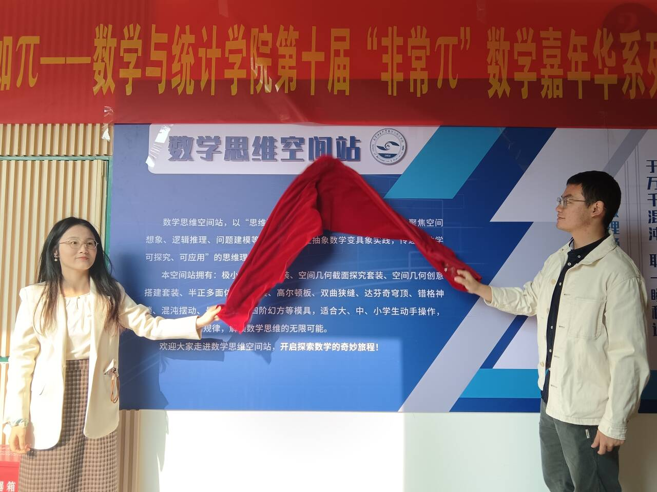 为进一步弘扬数学文化,激发学子探索热情,营造浓厚校园学术氛围,数学与统计学院在数统楼二楼顺利举办第十届“非常 π 数学嘉年华” 开幕式活动。与此同时,“数学思维空间站” 也正式启动。学院团委书记梁卡霖,辅导员卢若楷、滕容梅老师,兼职辅导员老师们以及各学院学生代表齐聚一堂,共同见证这场数学盛宴的开启。