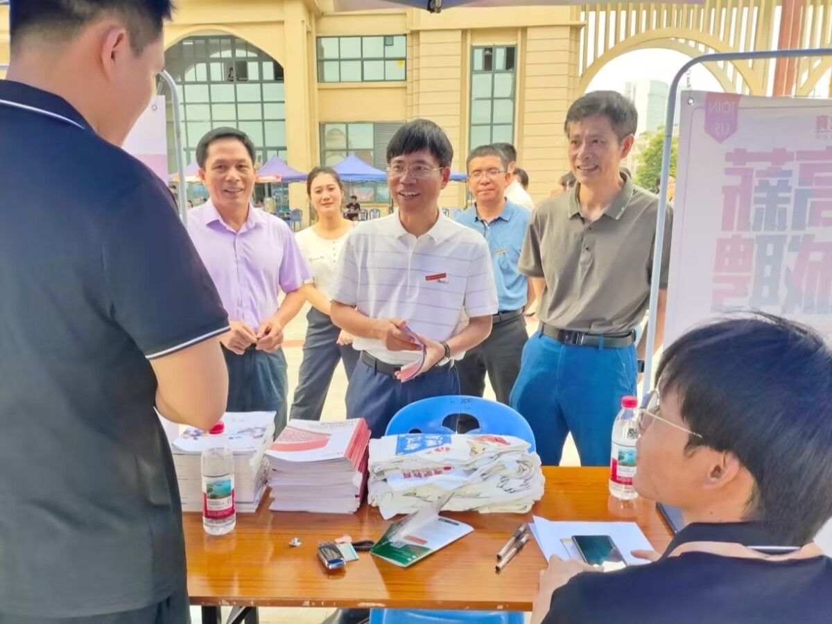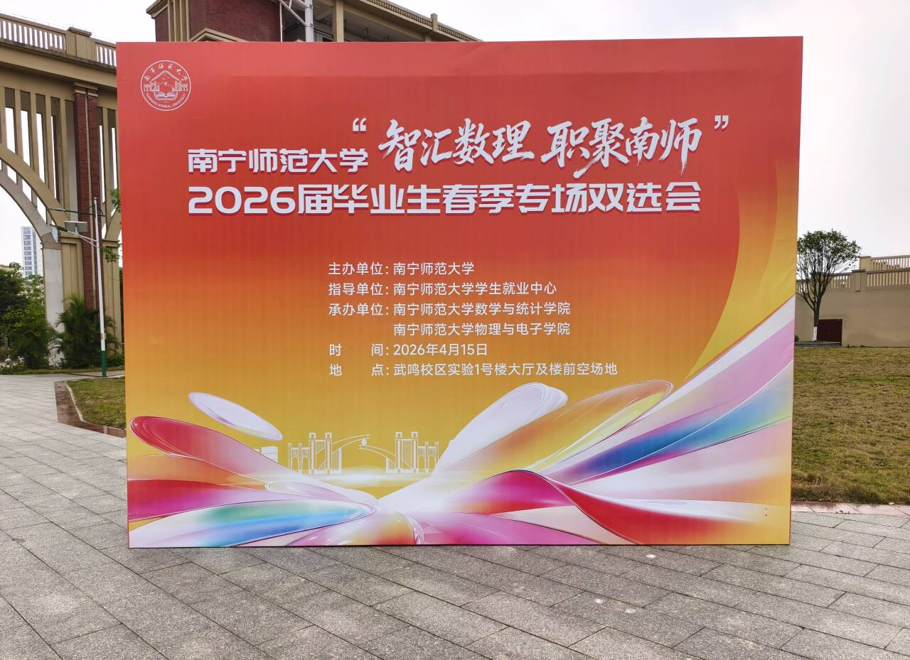 为深化产教融合,精准对接数字经济与智能制造时代人才需求,助力2026届毕业生高质量就业,4月15日,由南宁师范大学主办,数学与统计学院、物理与电子学院联合承办的“智汇数理,职聚南师”2026届毕业生春季专场双选会在武鸣校区实验楼广场成功举办。学校党委常委、组织部部长李图仁,数学与统计学院党委书记余敢才、党委副书记王卫彬,物理与电子学院党委副书记(主持学院党委全面工作)农保雄、党委副书记何聪,学校学工部部长助理韦春莲莅临现场指导就业工作,学院党委组织员、全体毕业班班主任及辅导员全程参与服务保障。